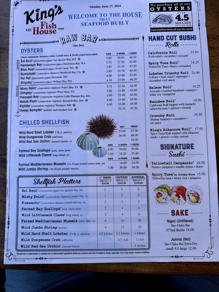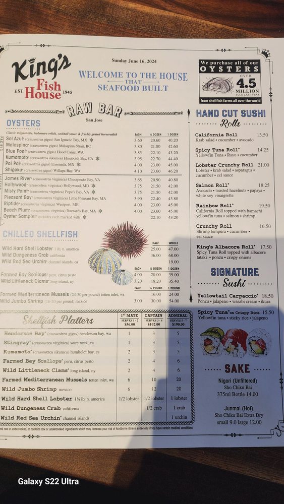 Introducing the menu at King’s Fish House - San Jose, where exquisite seafood awaits. Located at 2855 Stevens Creek Blvd Ste 1820, this restaurant offers a range of amenities such as outdoor seating, full bar, and wheelchair access. With a diverse menu featuring options like Kumamoto Oysters and Cioppino, every dish is a culinary delight. Customers rave about the exceptional service, with mentions of friendly staff like Nicholas and Chris creating memorable dining experiences. The crispy calamari and linguini with clams are highlighted favorites, while the selection of oysters from the Pacific coast receives high praise. Whether you're looking for a casual lunch spot or an upscale dinner setting, King’s Fish House - San Jose promises a delightful seafood feast with top-notch service.